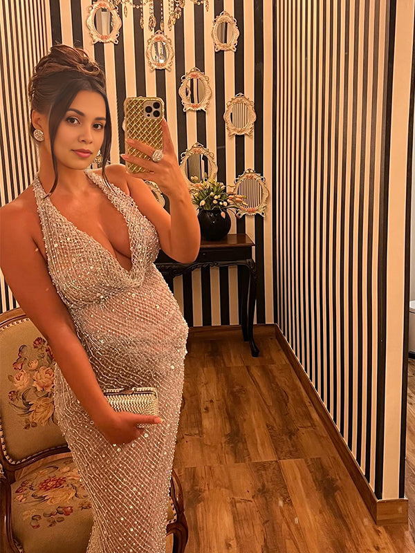 Vestido Maxi Maternidad de Lentejuelas y Espalda Descubierta para Fiesta y Baby Shower