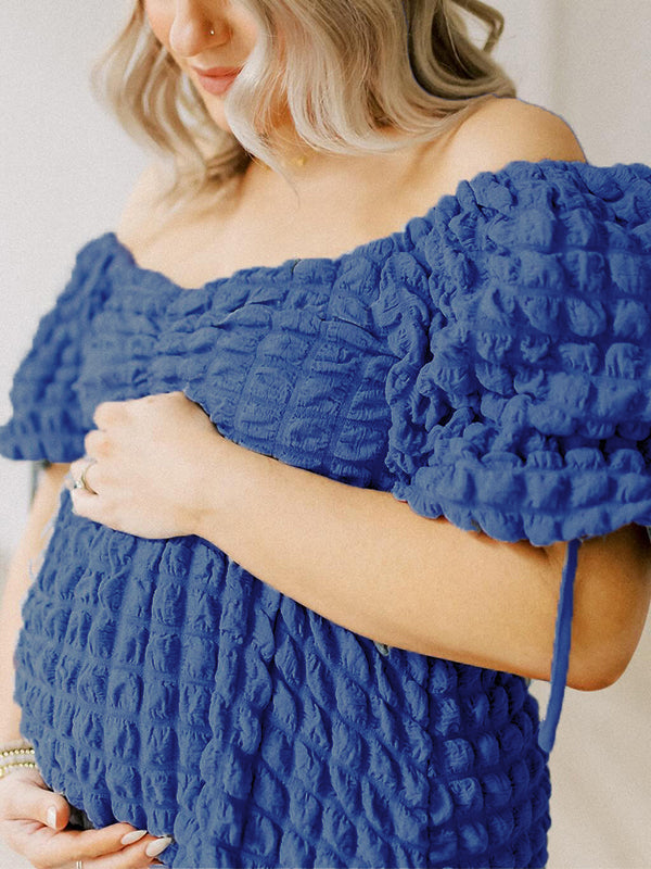Vestido Maxi Maternidad Elegante con Fruncido y Manga Abullonada para Fiesta Fotos